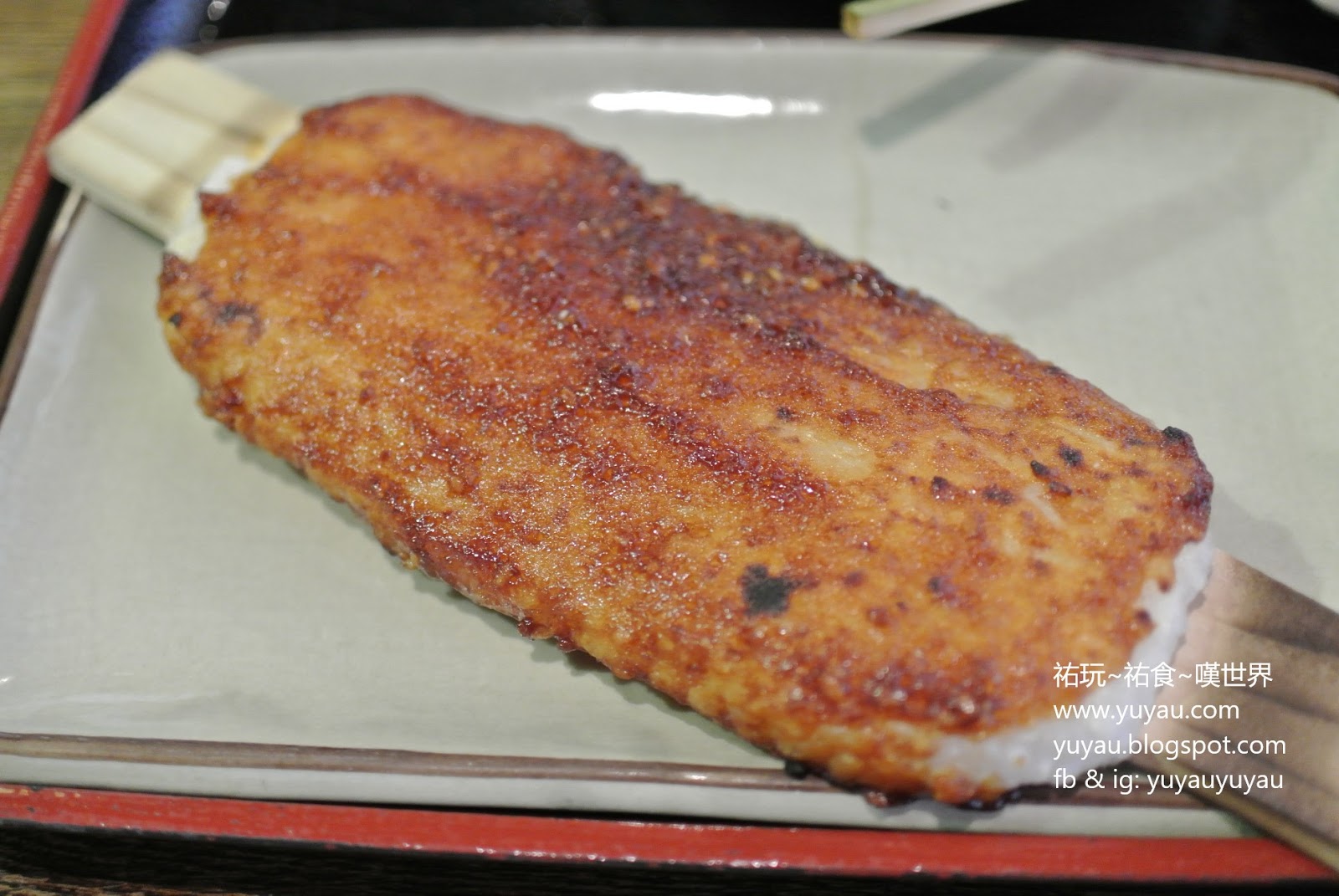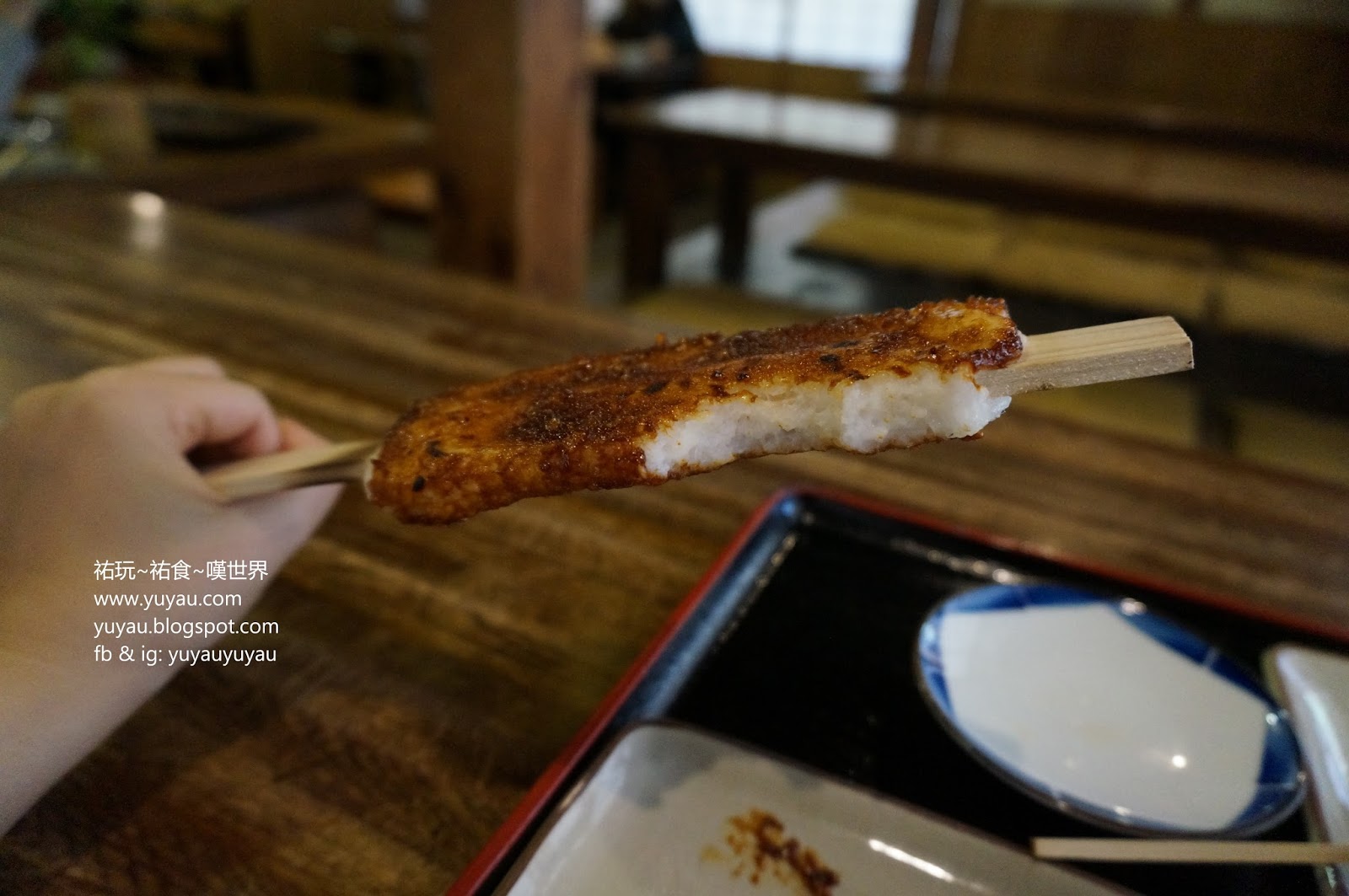 五平餅烤得焦香,味噌醬帶鹹,配吃著裡面的飯味道就會剛好。