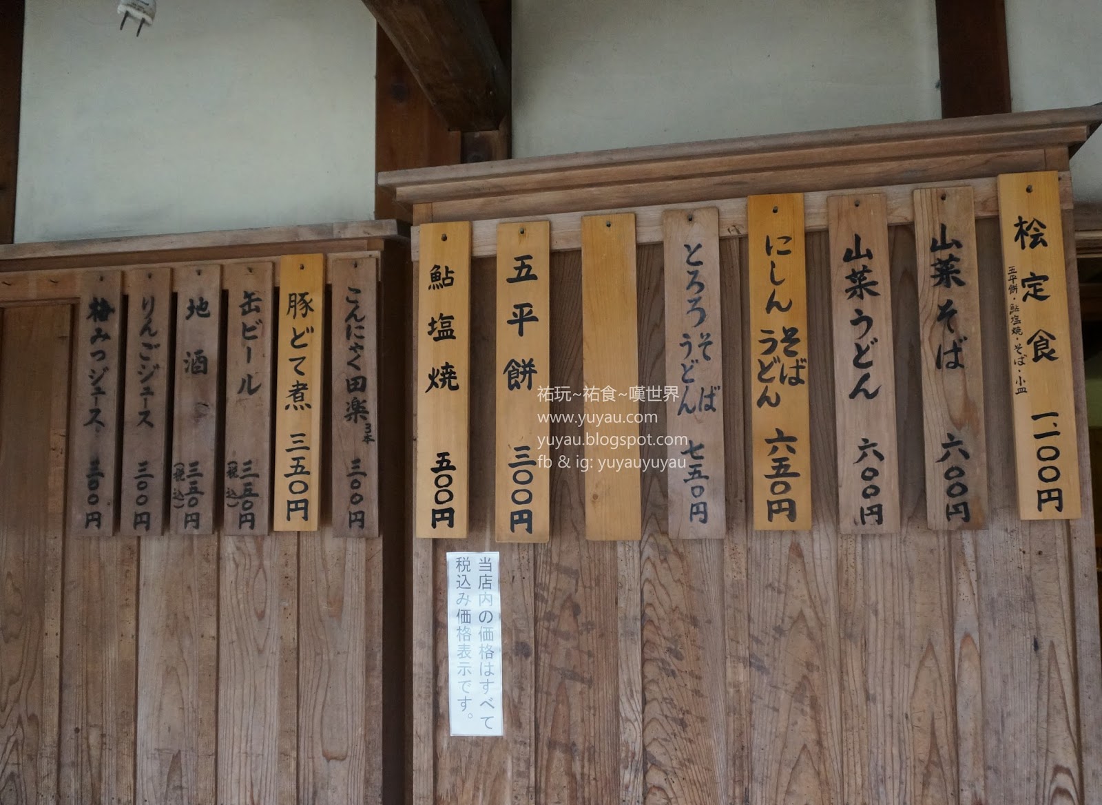 過了待月橋後再往前走就會看到檜茶屋,是家很有鄉村風味的餐廳,門口放著一大塊木板寫上五平餅,是店家主打推介呢!