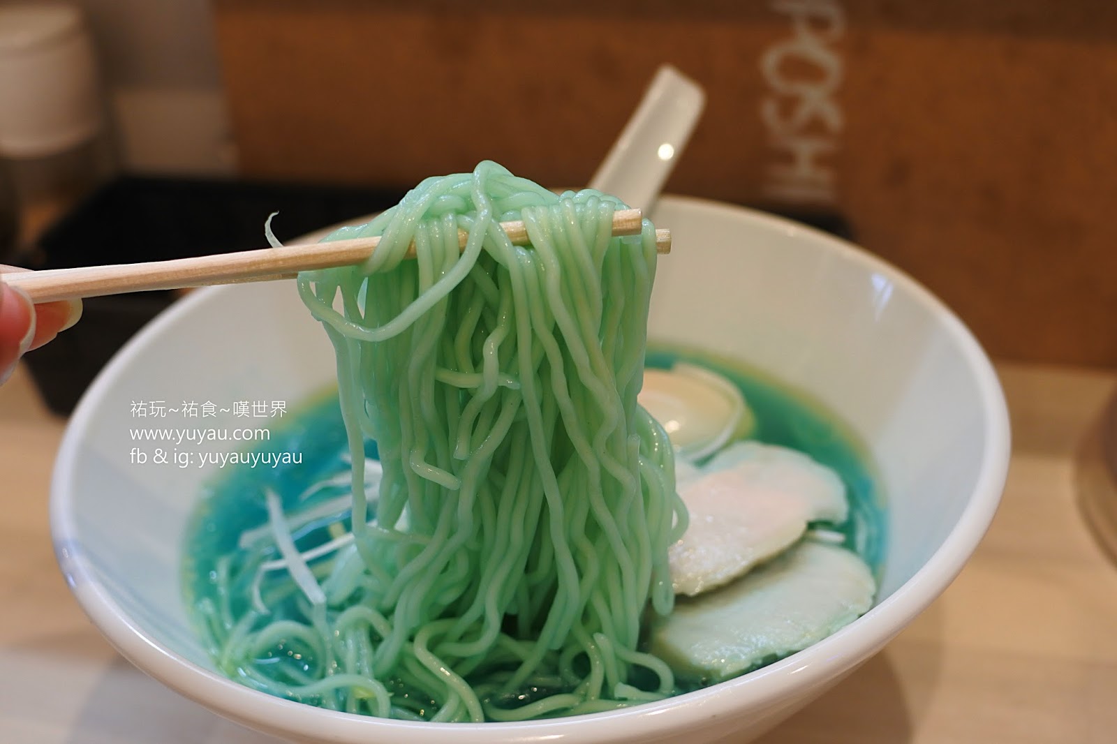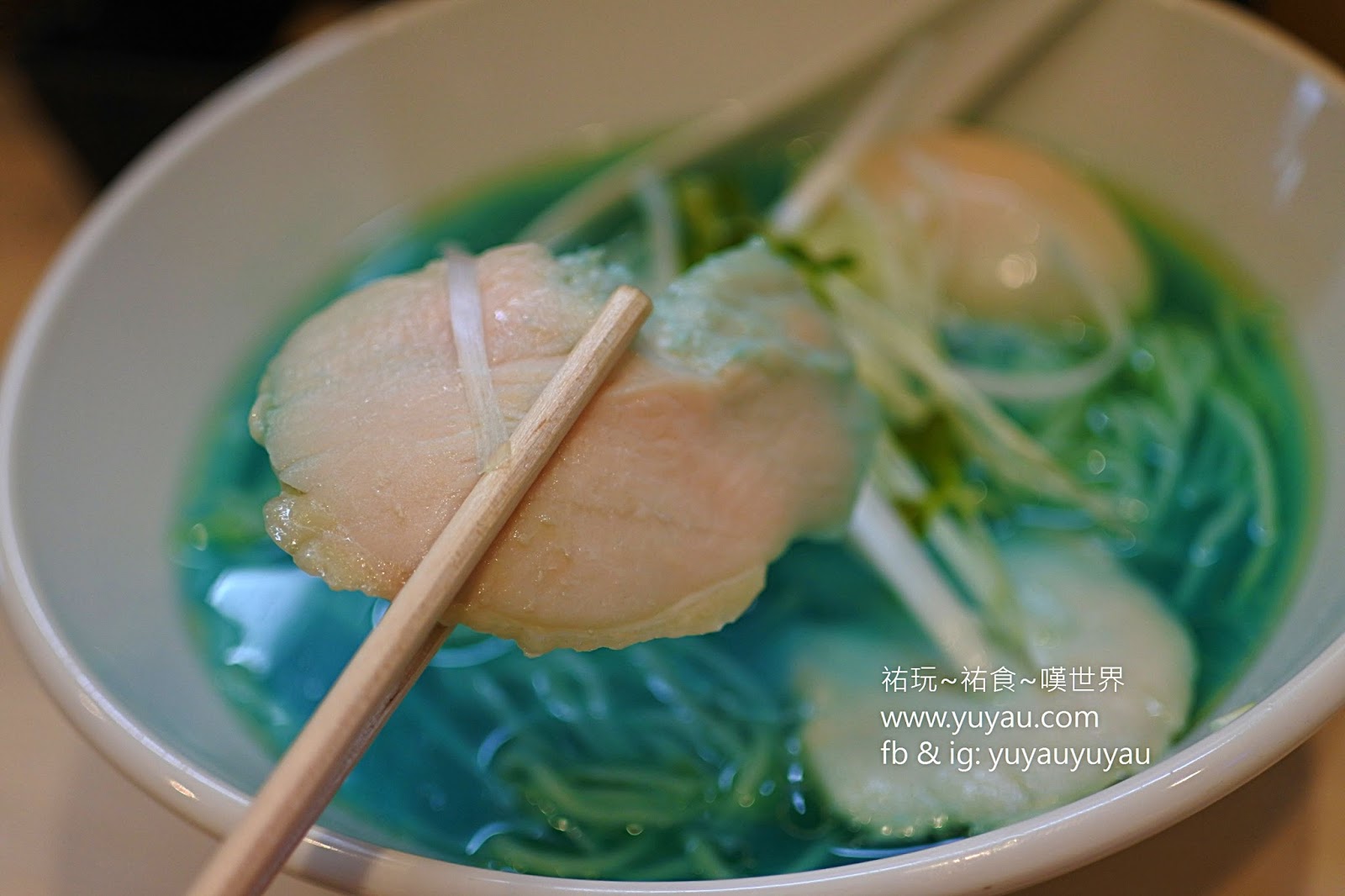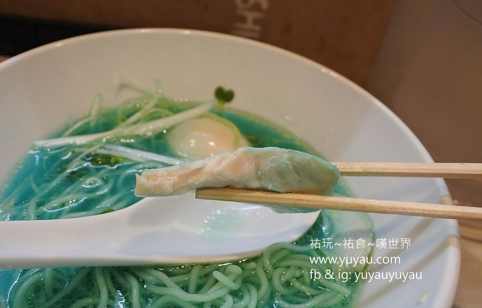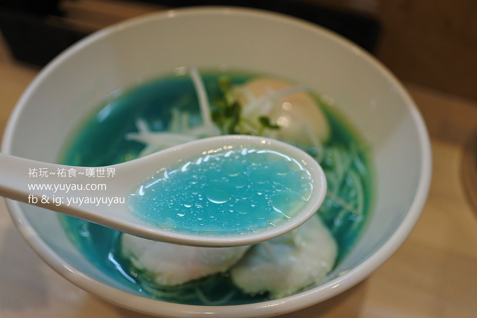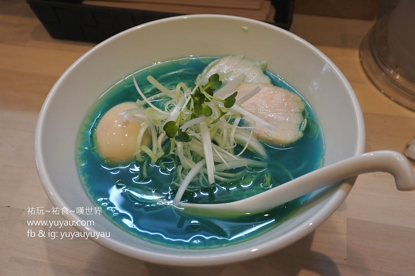 碗、湯匙、雞叉燒、雞蛋、以及蔥絲都是白色系的,顯得藍色湯更突出、更夢幻!