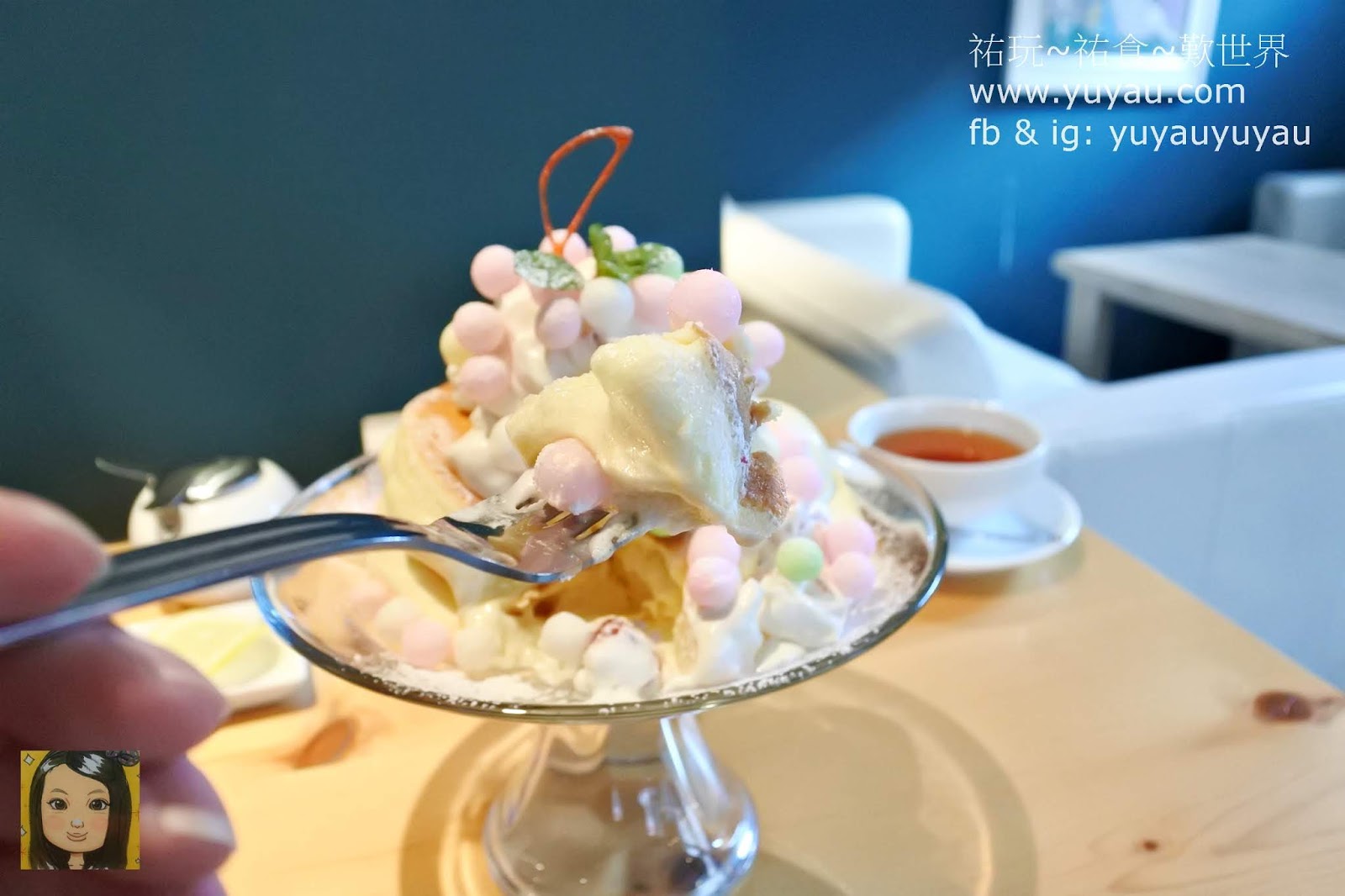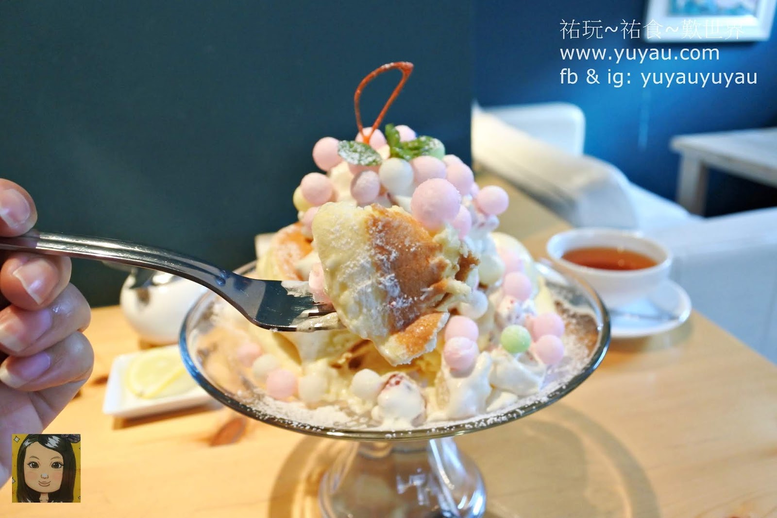 鬆餅超軟綿,吃了完全沒有負擔,上面的忌廉(奶油)一點都不膩,而且奶味很濃。那些夢幻的粉色圓球是糖粉,不會太甜。將三者一同放入口,每一口都感到超幸福!